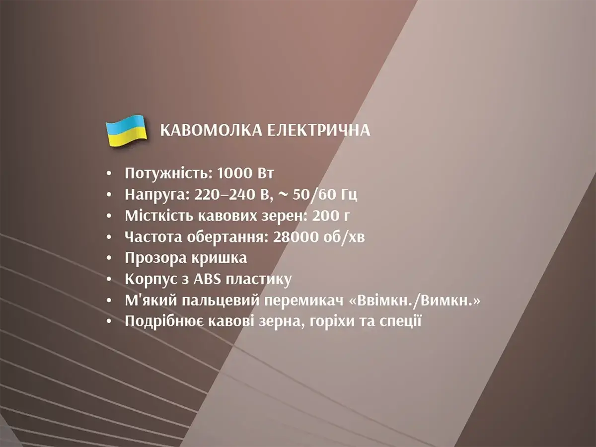 Кавомолку електричну можна використовувати для подрібнення кавових зерен, а також для подрібнення рису, шоколаду, бобів, горіхів, спецій та іншого насіння.