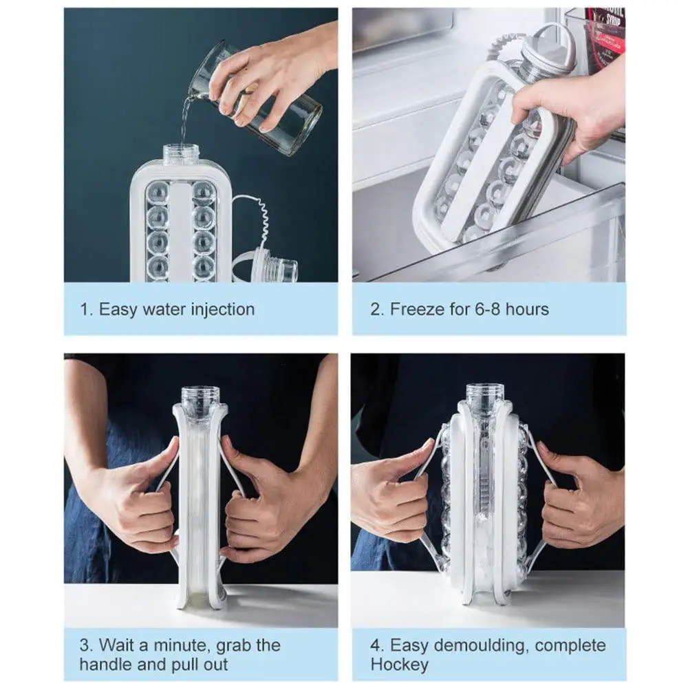 Наша форма для льоду передбачає два стани — вузьке (у разі заморожування кульок льоду) і широке — коли стулки розтягнуті вбік. В обох станах формочки для льоду герметичні. Цей переносний льодогенератор зверху обладнаний кришкою, що щільно загвинчується — у ньому можна охолоджувати напої, соки в холодильнику, як у фляжці — її об’єм у широкому стані достачений для заповнення трьох склянок охолодженим напоєм.
