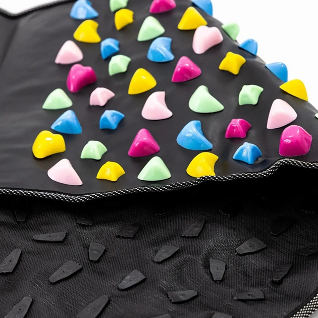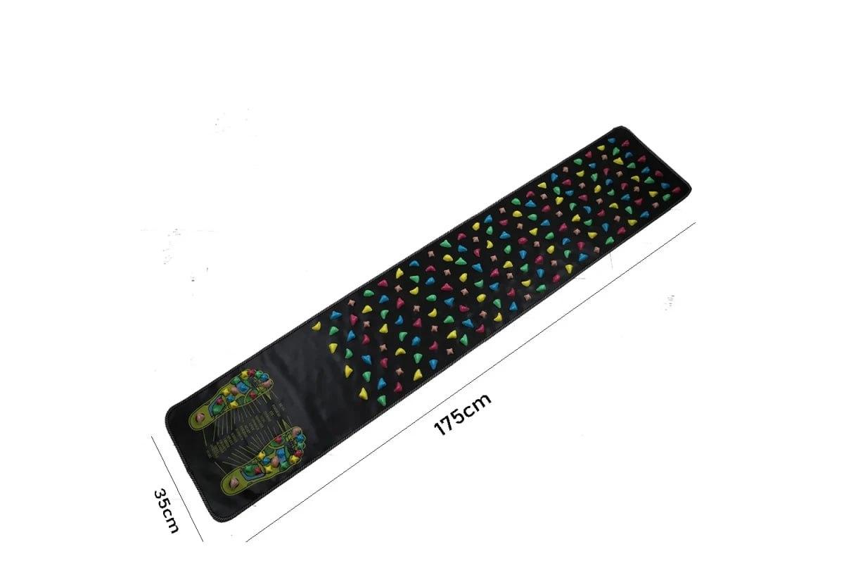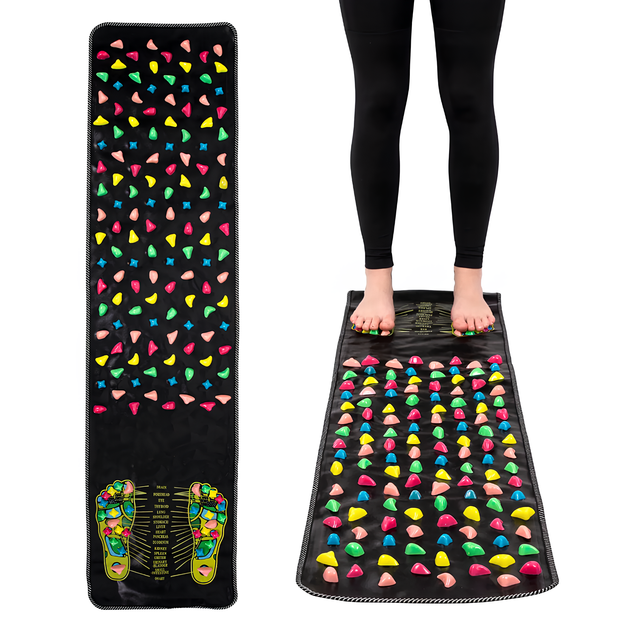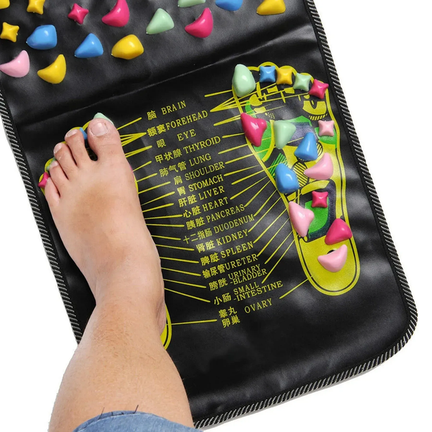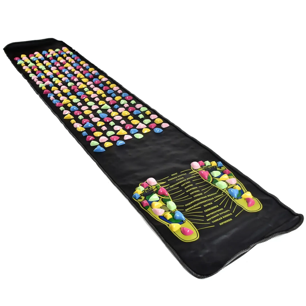 Масажний килимок для ніг призначений для самостійного впливу на рефлексогенні зони стоп, що підходить як для домашньої ранкової гімнастики, так і для тренувань у спортзалі. Його масаж зміцнює стопи, покращує рухливість гомілковостопного суглоба, а також запобігає втомі, будучи ефективною профілактикою сколіозу та остеохондрозу.
