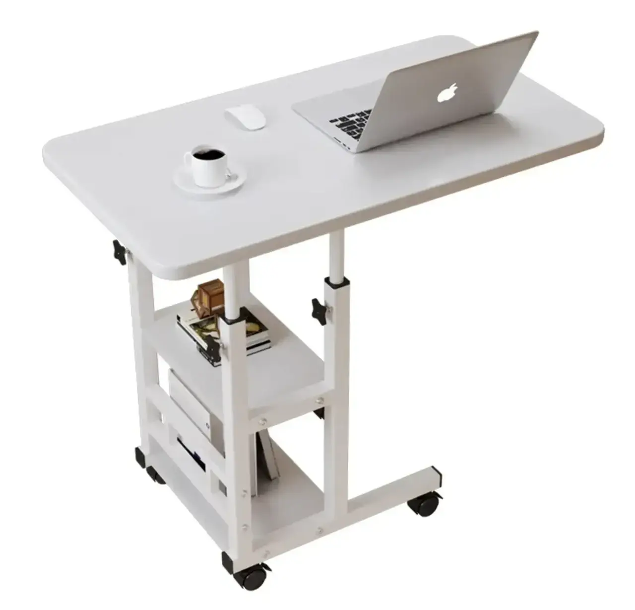 Приліжковий, приставний столик із регульованою висотою на коліщатках із двома поличками, 80x40x60-85 см. Білий
