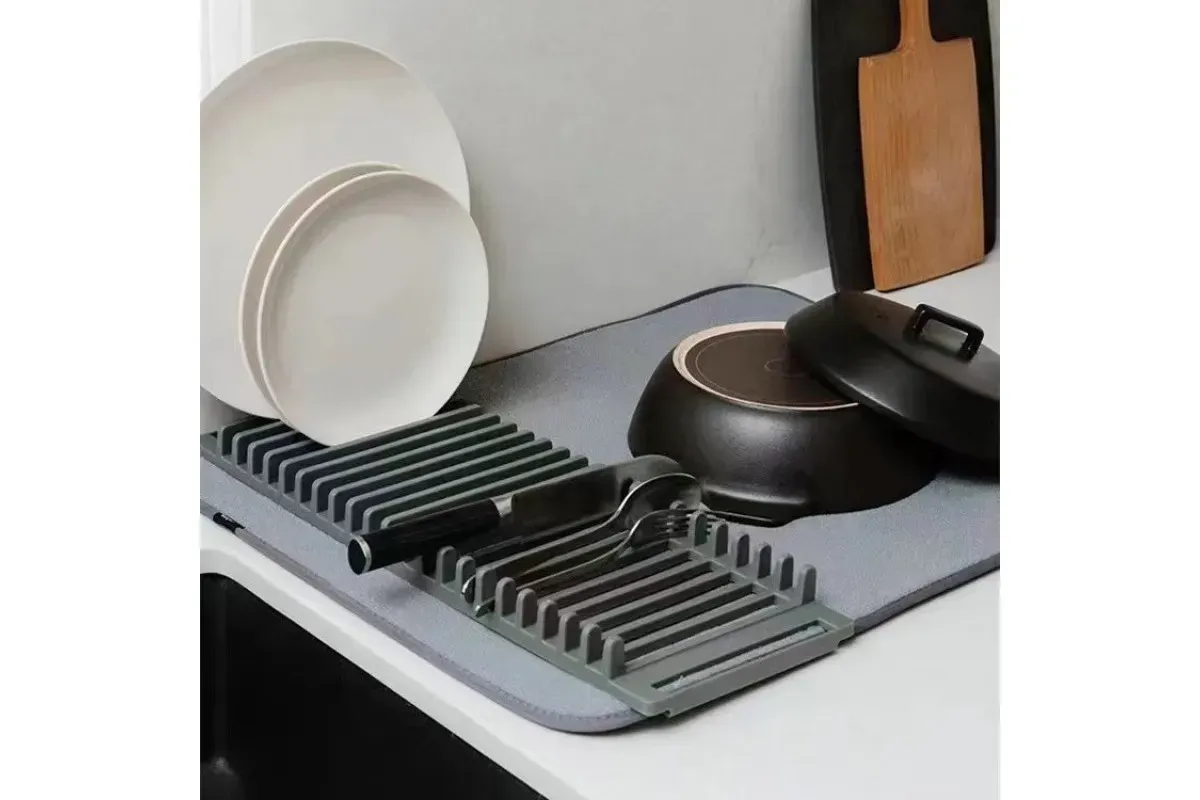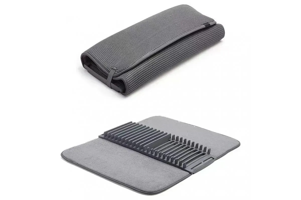 Практичний килимок для сушіння посуду розміром 60×45 см швидко вбирає воду, захищає стільницю від плям та подряпин і створює охайний простір на кухні. Легкий, м’який і компактний — зручно скласти та зберігати, а нейтральний сірий пасує до більшості інтер’єрів.