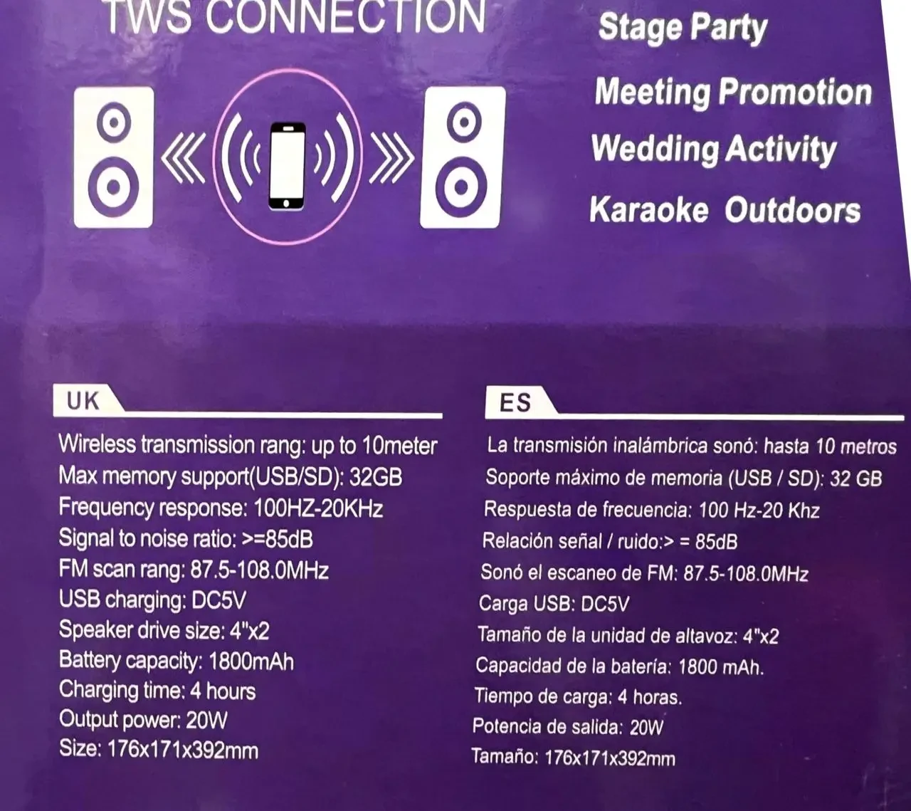Колонка має 1 дротовий мікрофон і ідеально підходить для різноманітних заходів, таких як шкільні урочистості, вечірки, концерти, виступи, урочисті заходи, весілля, конференцій, дискотеки, виставки, рекламні акції.