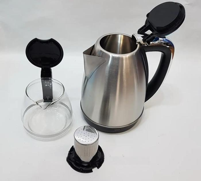 Електрочайник впевнено займає важливе місце у нашому побуті. Вирішальний фактор – зручність у використанні та швидкість закипання води. Електрочайник є екологічно чистим, удароміцним, із зручним в обслуговуванні матеріалом, покриття нагрівального елемента – нержавіюча сталь. Особливістю комплекту є підставка та заварник, в якому ви зможете не відходячи від місця заварити свій улюблений чай.