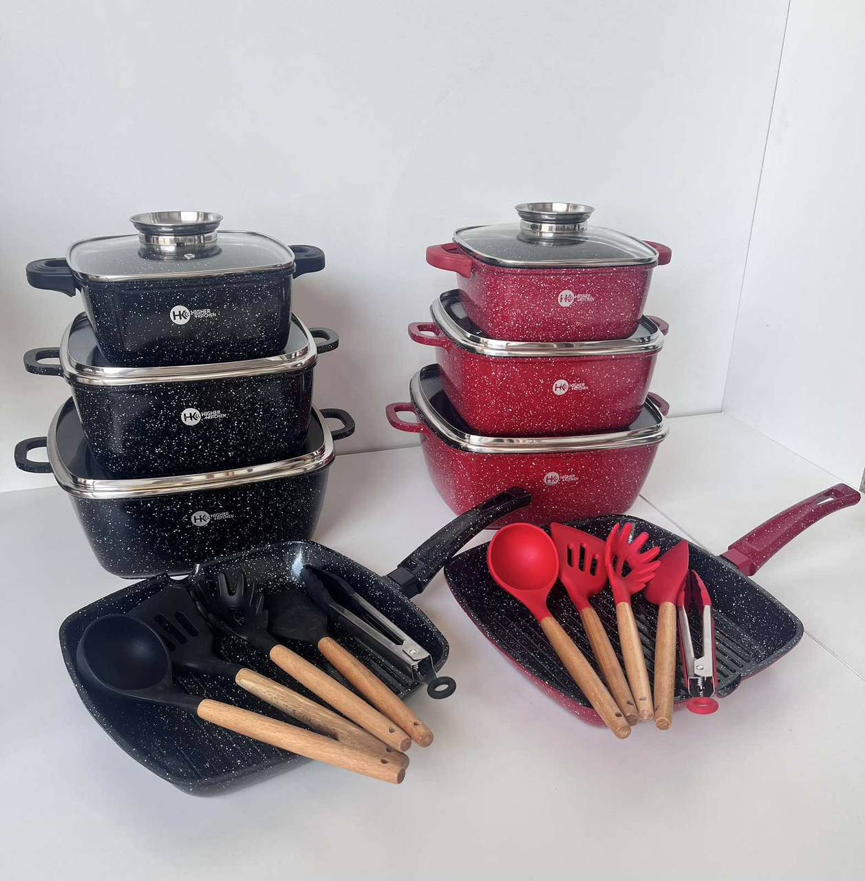 Набір кастрюль сотейник квадратна сковорода Higer Kitchen НК-317 з лопатками 14 предметів (Червоний, Чорний)