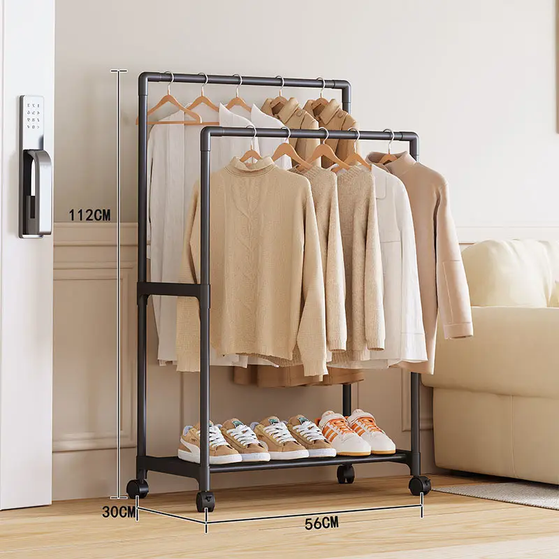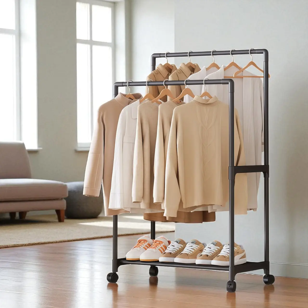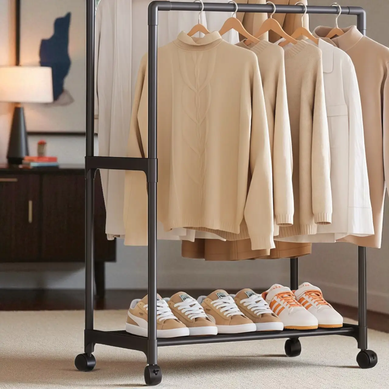 Ця компактна стійка-вішалка на колесах (модель YH9918-1) призначена для зручного зберігання одягу та взуття в будь-яких приміщеннях. Вона оснащена двома перекладинами для розвішування речей та нижньою полицею для взуття, що дозволяє раціонально використовувати простір навіть у невеликій кімнаті. Легка конструкція та коліщатка забезпечують мобільність та зручність переміщення.