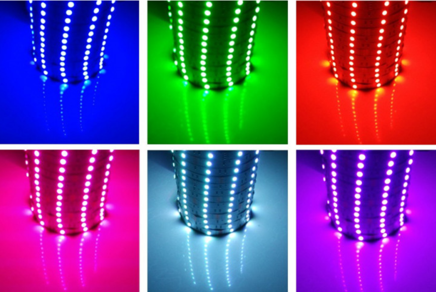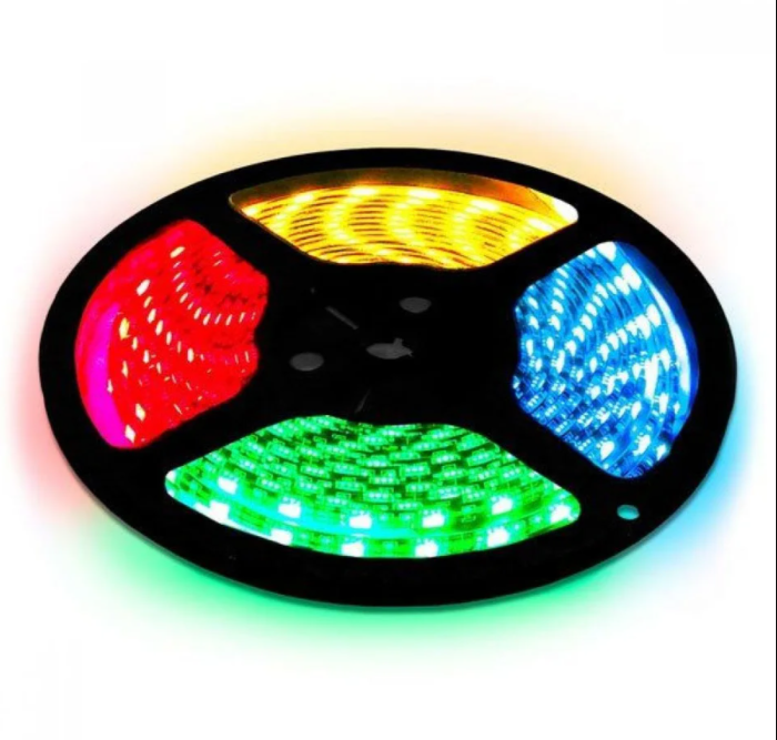 Гибкая светодиодная лента – это осветительный модуль, который состоит из гибкой основы, нанесенных на нее токопроводящих дорожек, резисторов и светодиодов, а так же управляющих элементов. Ширина ленты 1 см, толщина около 2мм, а длинна в бобине 5м. LED лента отлично подойдет для подсветки, поскольку имеет высокий уровень яркости и большой угол свечения равный 120°. На ленте расположены LED диоды, каждый из которых включает в себя три цвета зеленый, синий, красный.