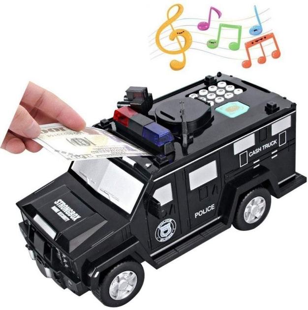 Секретний сейф-скарбничка з паролем та відбитком пальця у вигляді поліцейської машини це унікальна іграшка, яка навчить дитину поводитися з грошима! Ця модель виконана у вигляді інкасаторської вантажівки з безліччю функціональних деталей. Іграшка привчить юного бізнесмена відкладати заощадження та дозволить зберігати гроші під надійним захистом кодового замку.