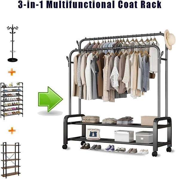 - Багатофункціональність: Ця подвійна стійка-вішалка ідеально підходить для зберігання одягу та взуття, надаючи можливість ефективно організувати простір.